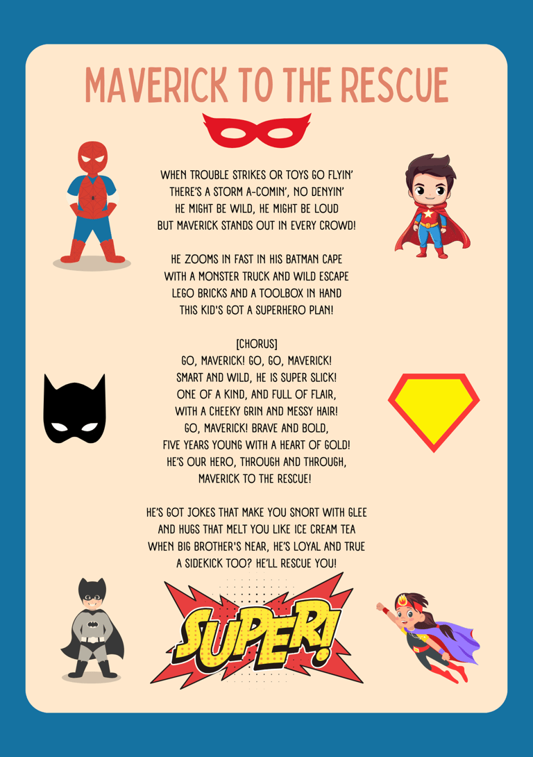 This is an example of the beautifully designed lyrics page you’ll receive as a downloadable PDF when you purchase a My Little Darlings package. The sample shown here is part of our Super-Star Package, which includes a custom theme or storyline woven into the lyrics, such as a superhero adventure, sports champion journey, or wild explorer tale.